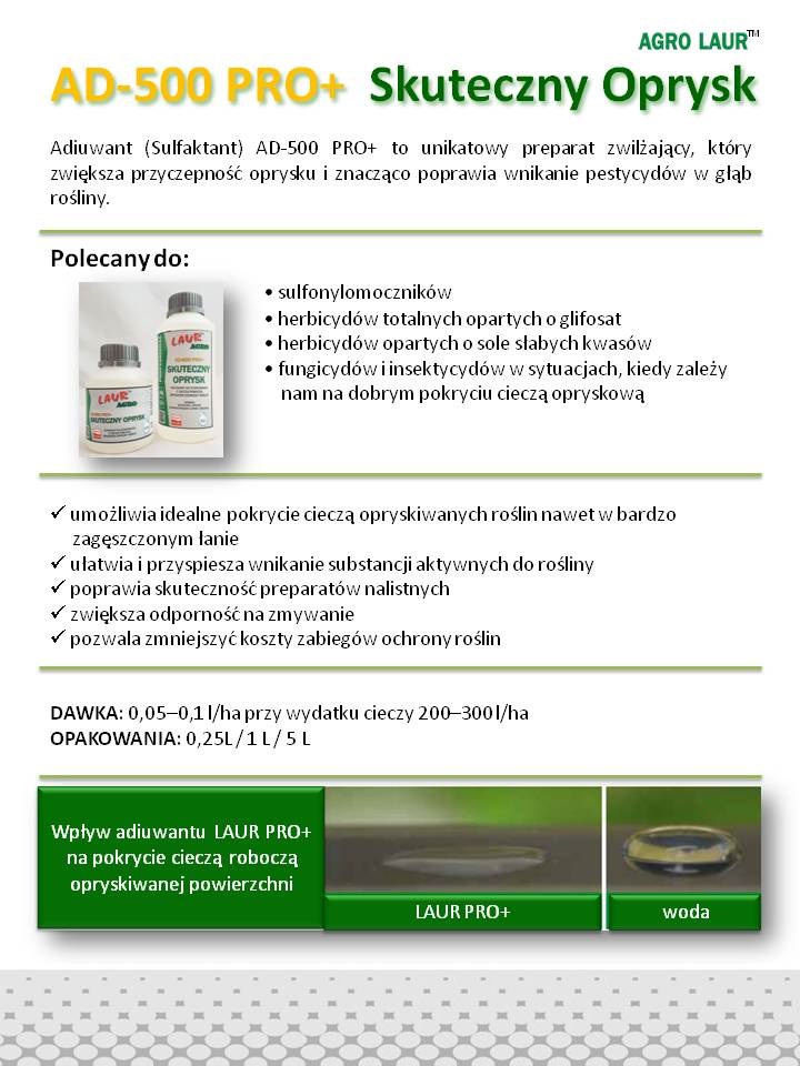 Profesjonalny adiuwant AGRO LAUR AD500 PRO+ do stosowania z cieczą roboczą środków ochrony roślin. Unikatowy preparat zwilżający, który zwiększa przyczepność oprysku i znacząco poprawia wnikanie pestycydów w głąb rośliny.
