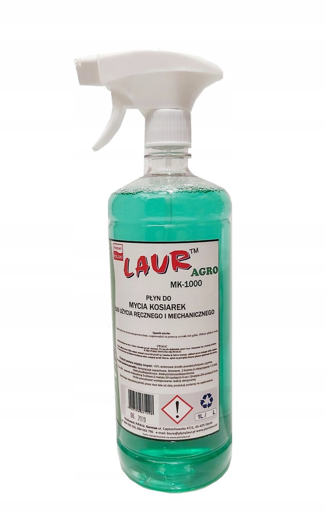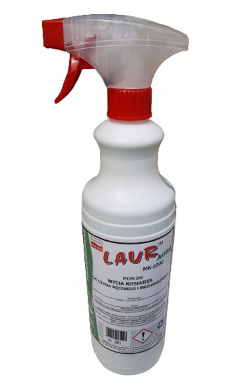 Profesjonalny płyn AGRO LAUR MK-1000 do mycia kosiarek i traktorów ogrodowych. Jest to specjalna formuła myjąca z zabrudzeń "rolniczych", nie niszczy oznaczeń i naklejek.