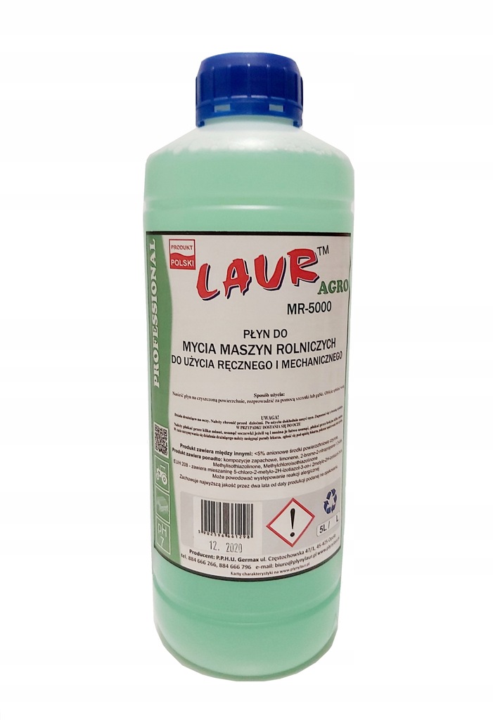 Profesjonalny płyn AGRO LAUR MR-5000 do mycia pojazdów i maszyn rolniczych z zewnątrz. Do użytku ręcznego i mechanicznego. Jest to specjalna formuła myjąca z zabrudzeń "rolniczych", nie niszczy oznaczeń i naklejek.