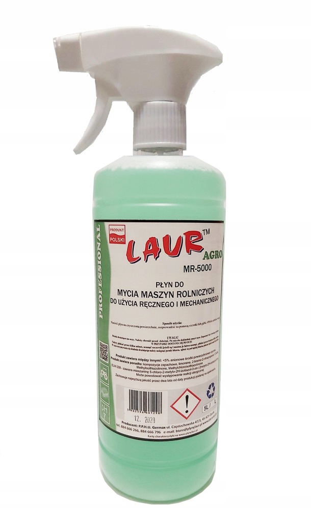 Profesjonalny płyn AGRO LAUR MR-5000 do mycia pojazdów i maszyn rolniczych z zewnątrz. Do użytku ręcznego i mechanicznego. Jest to specjalna formuła myjąca z zabrudzeń "rolniczych", nie niszczy oznaczeń i naklejek.